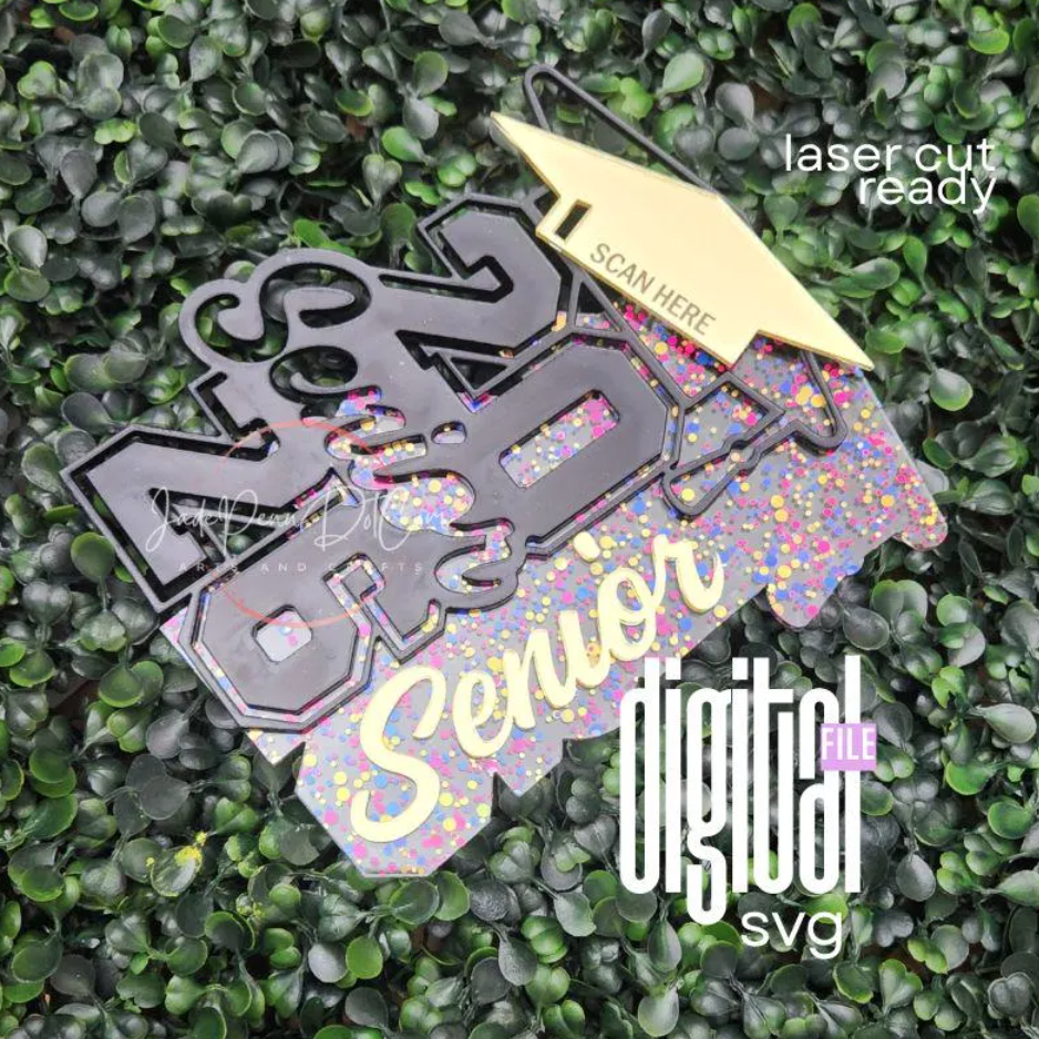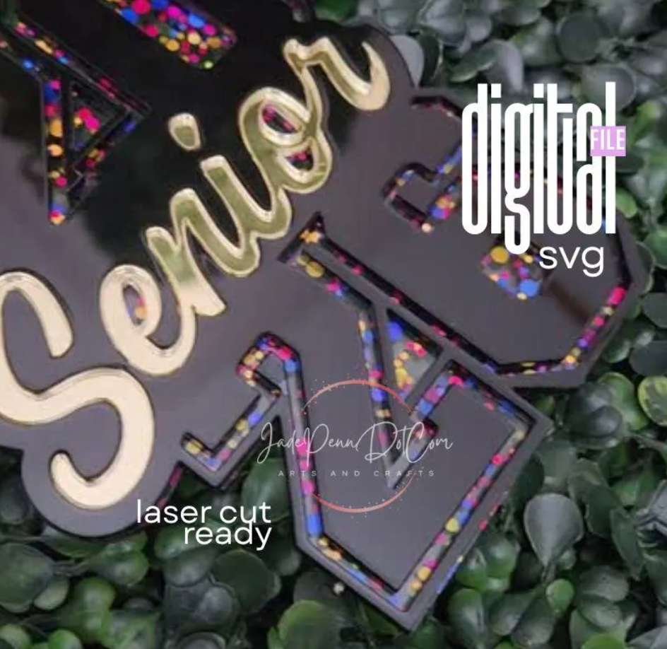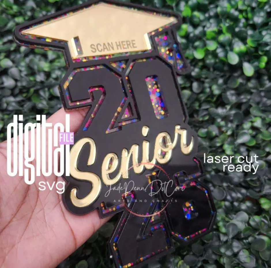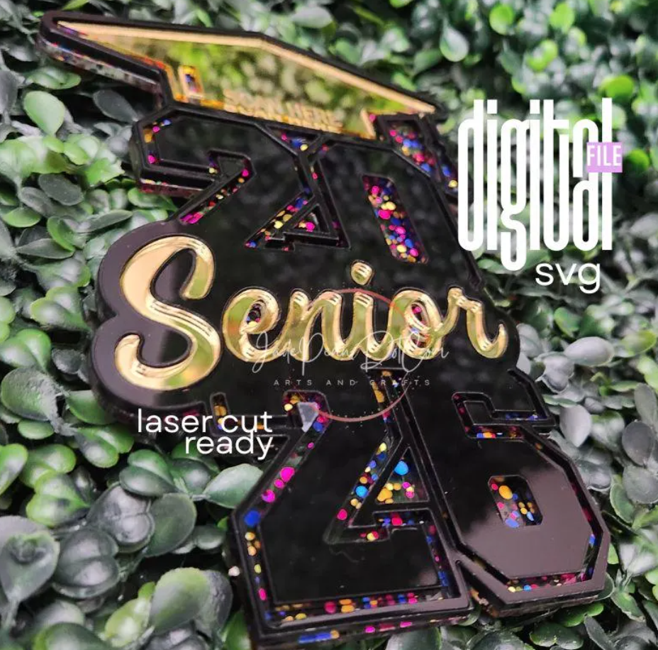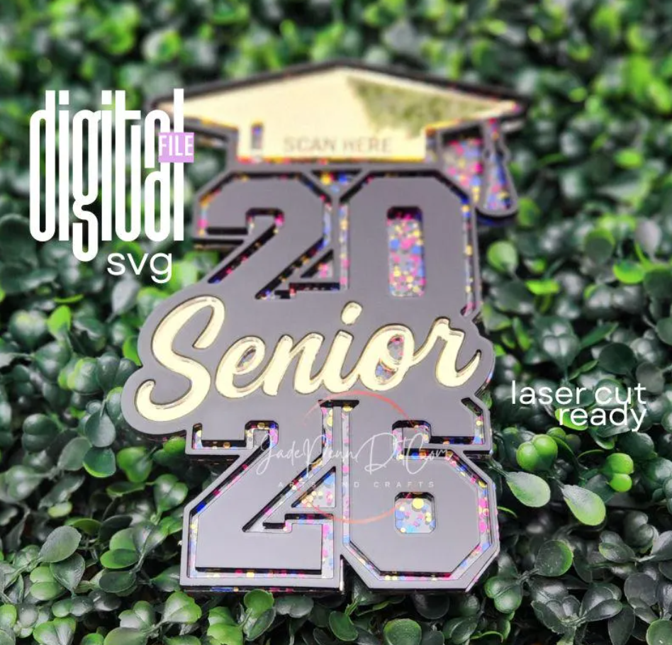 Celebrate the Class of 2026 in style with this 2026 Senior Graduation Sign SVG, designed for fast and easy laser cutting on Glowforge, xTool, OMTech, Muse, Cricut, and more. This digital file creates a bold, eye-catching senior sign featuring stacked “2026” numbers, a stylish script “Senior,” and a graduation cap top layer — perfect for décor, gifts, senior night, photo props, keychains, tags, and table displays.
