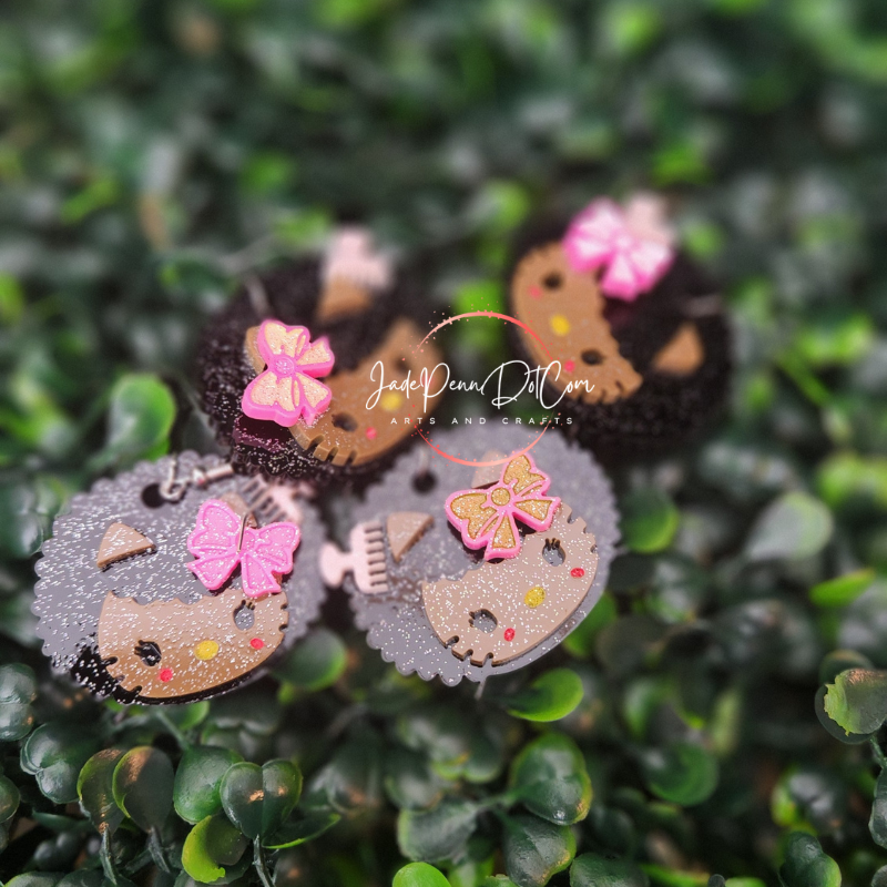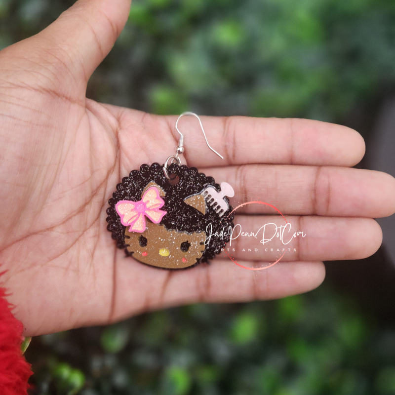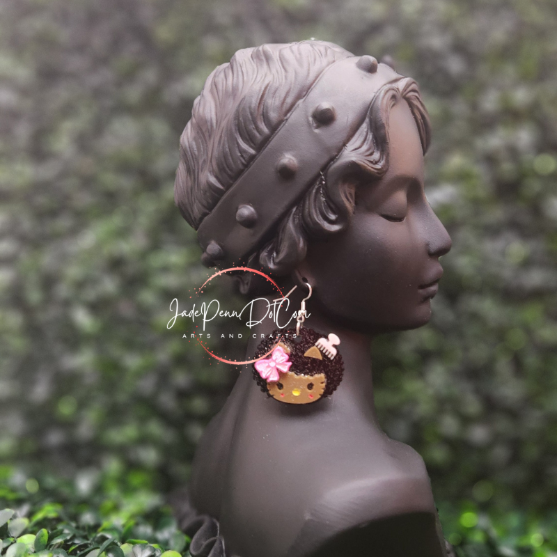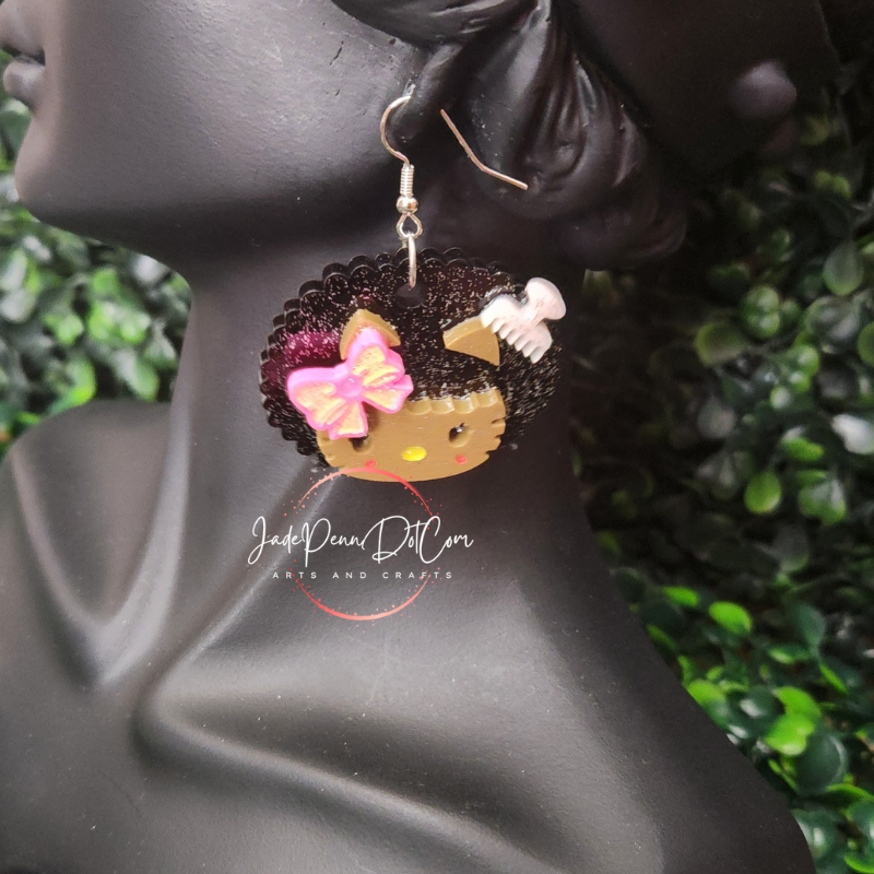 Make a bold and adorable statement with these Afro Hello Kitty Dangle Earrings! Each pair features a different and unique comb design and a vibrant bow color of your choice: Pink, White, Yellow, or Gold.