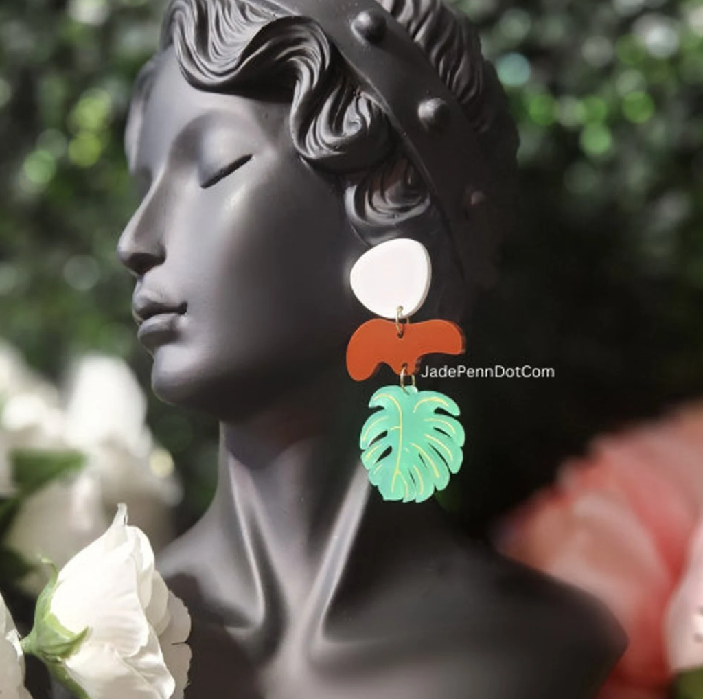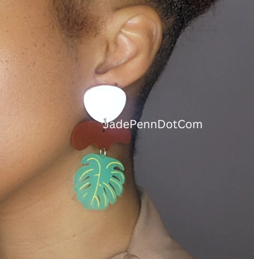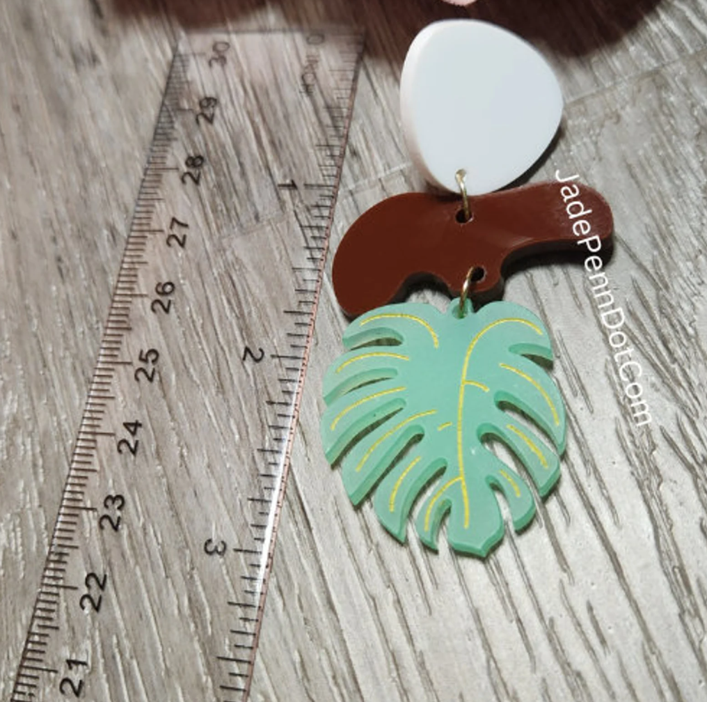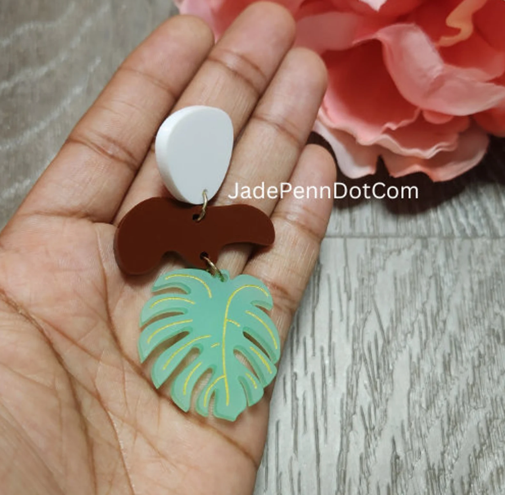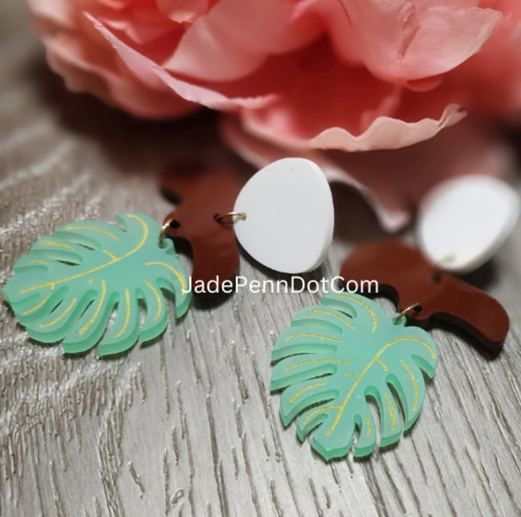 Ready to elevate your vacation wardrobe? These Tropical Leaf Dangle Earrings are your go-to accessory for sunshine, style, and statement! Each earring is laser cut from 1/8″ thick acrylic, featuring a hand-painted monstera leaf design in soft green with delicate yellow detailing. Accented with rich brown and white shapes for a bold, earthy contrast, these earrings are as lightweight as they are eye-catching.
