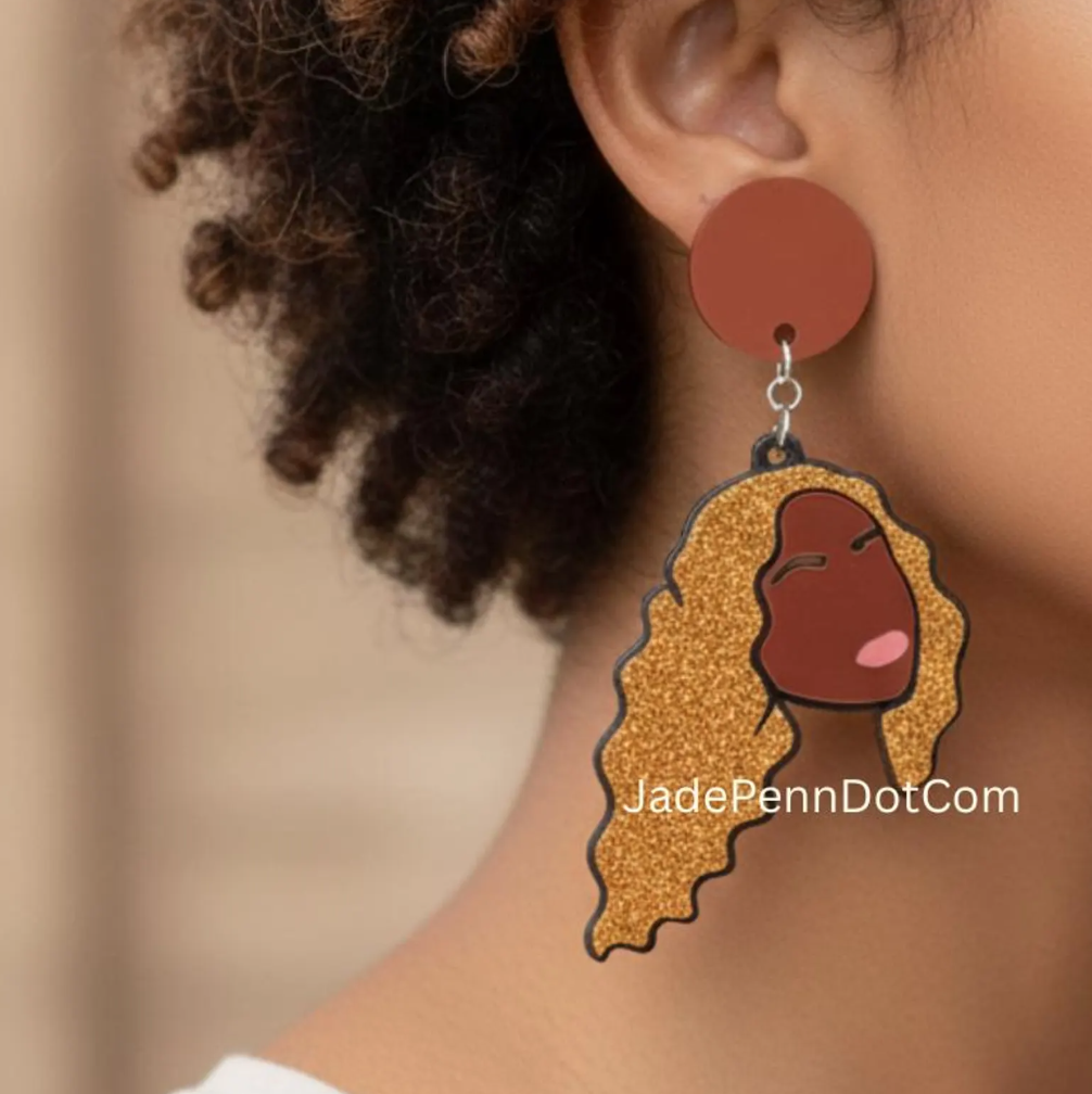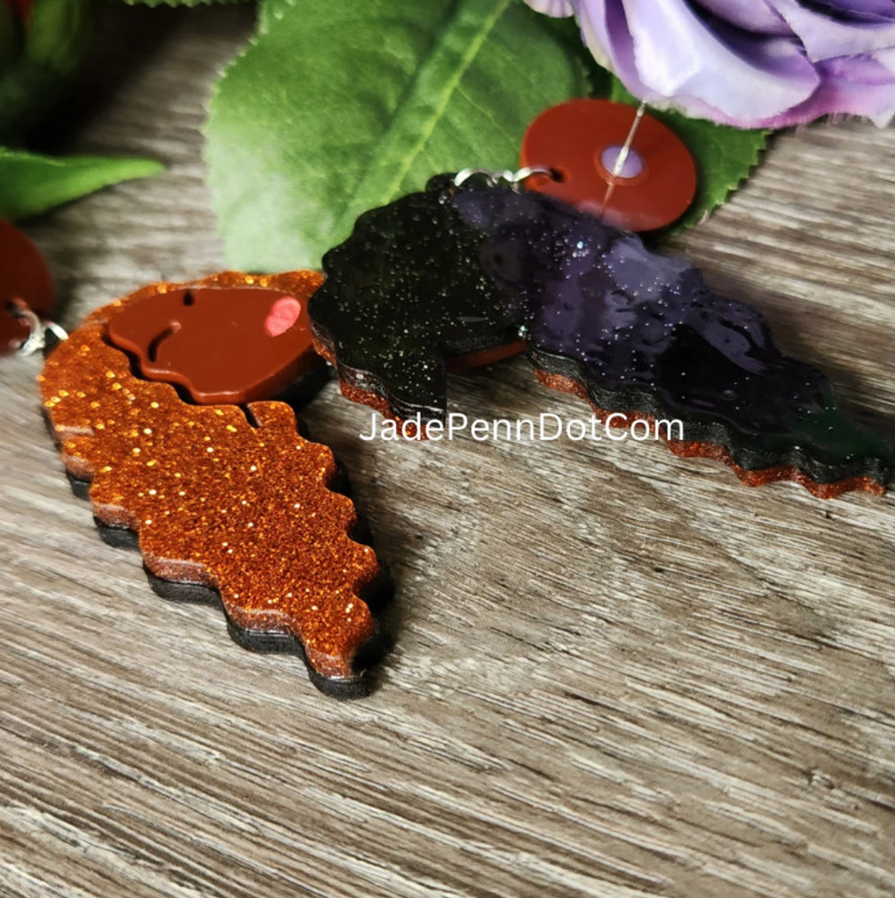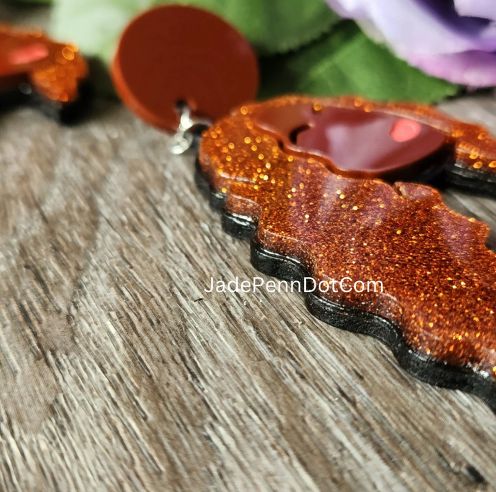 These earrings are the perfect accessory for any outfit, whether you’re dressing up for a night out or just adding a little something extra to your everyday look. They’re laser cut from brown acrylic and copper brown glitter acrylic, with a black wood backing. They are sturdy, with a resin coating that makes them extra shiny.